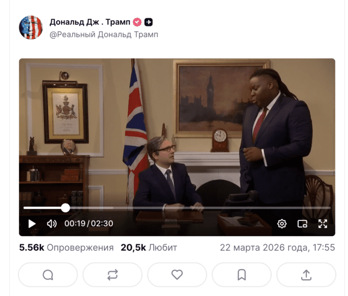 Сегодня днем президент США опубликовал на своей платформе Truth Social ролик из британской версии шоу «Субботним вечером в прямом эфире».