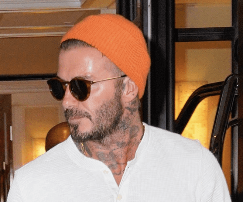 Дэвид Бекхэм в ярко-оранжевой шапке-бини в 2021 году