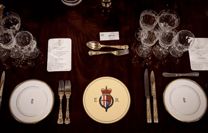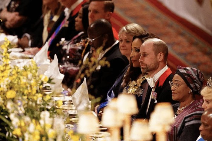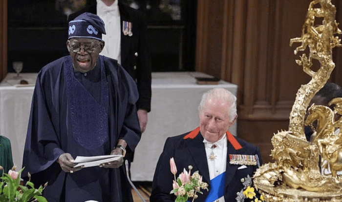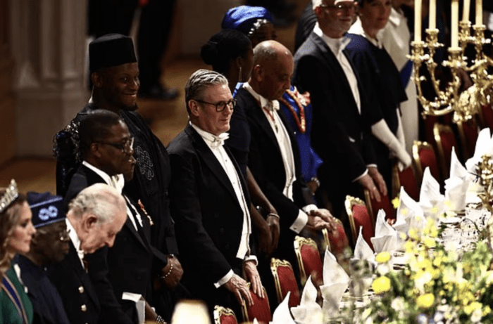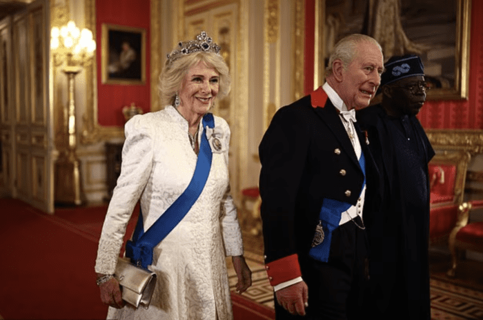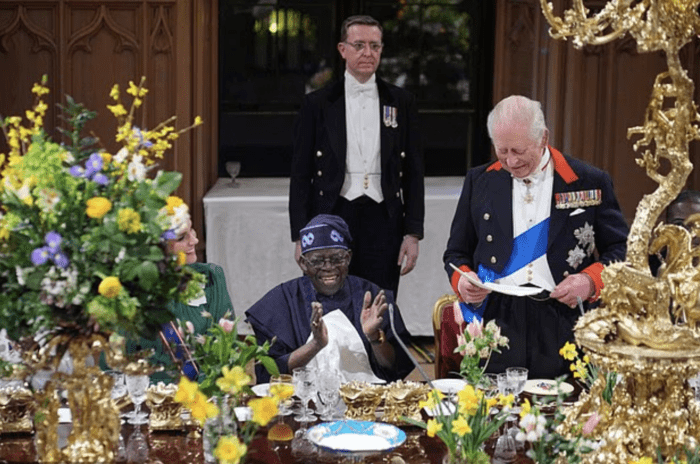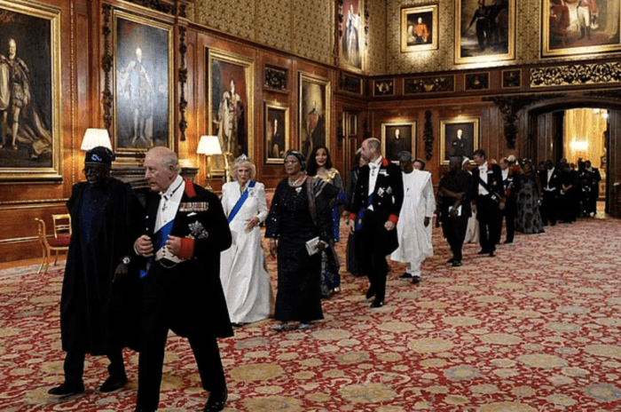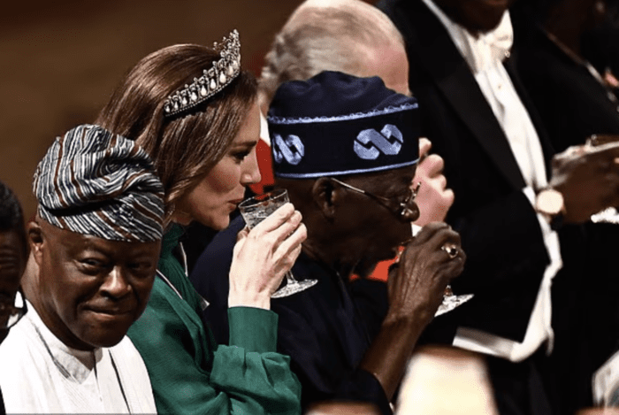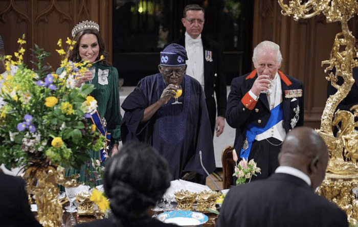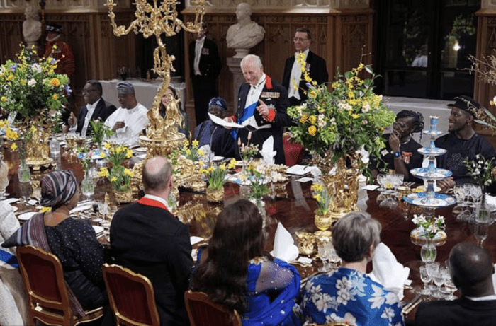 Принцесса Уэльская, президент и король произнесли тост в честь 160 гостей. Президент Тинубу пил апельсиновый сок, а члены королевской семьи — английское игристое вино.