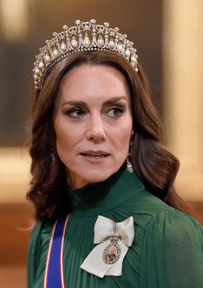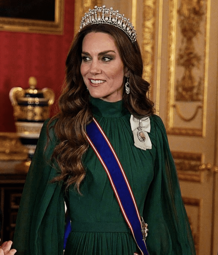 Принцесса Кэтрин выглядела невероятно величественно в струящемся зеленом вечернем платье от Andrew Gn с любимой диадемой Lover’s Knot и серьгами, принадлежавшими королеве Елизавете II.
