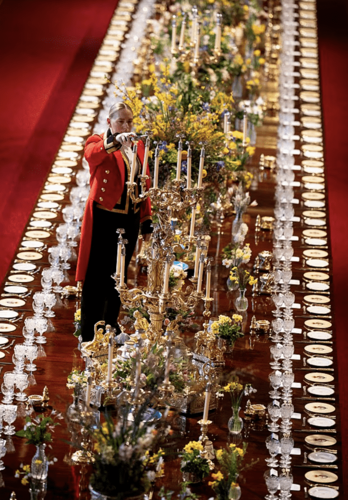 Персонал начал накрывать стол в понедельник утром, а последние штрихи были добавлены всего за несколько часов до того, как гости должны были сесть за стол. Неудивительно, ведь на 160 приглашенных пришлось 960 ножей и вилок и 62 перечницы.