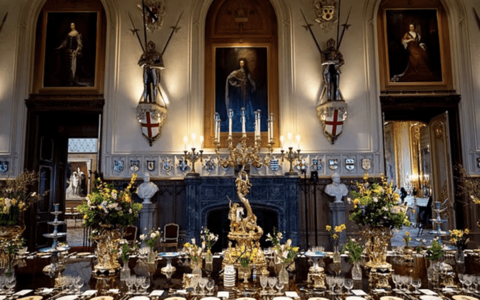 Обеденный стол длиной 155 футов, протянувшийся через весь зал Святого Георгия, был уставлен благоухающими весенними цветами, собранными в окрестностях, и освещен 143 свечами.