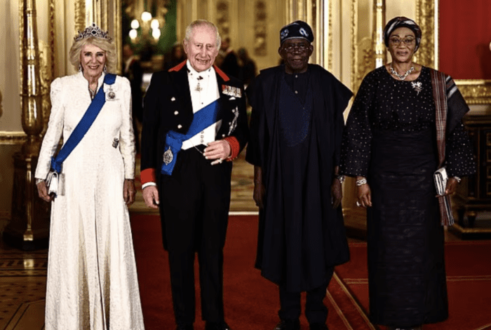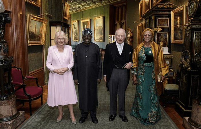 Бола Ахмед Тинубу и его жена, первая леди Олуреми Тинубу, заняли свои места среди членов британской королевской семьи в кульминационный момент их двухдневного визита.