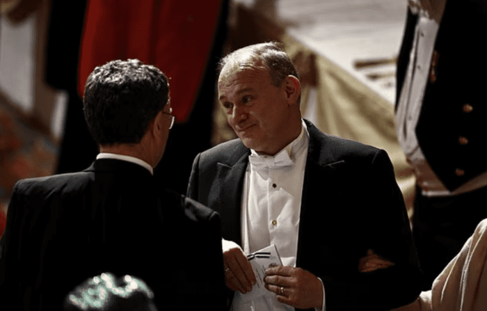Лидер партии либерал-демократов Эд Дэйви беседует с управляющим Банка Англии Эндрю Бейли во время банкета
