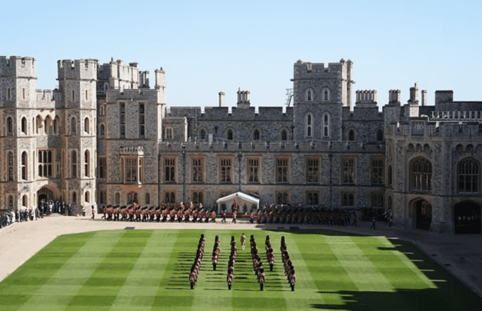 Затем король, Камилла, Уильям, Кейт, а также мистер и миссис Тинубу проследовали в процессии карет с традиционной пышностью и помпезностью через Виндзор к замковому двору, где их ждал почетный караул для торжественного приветствия.