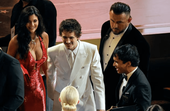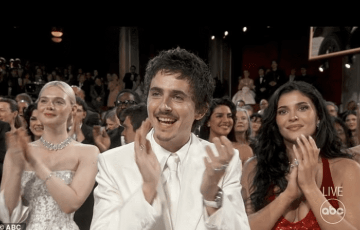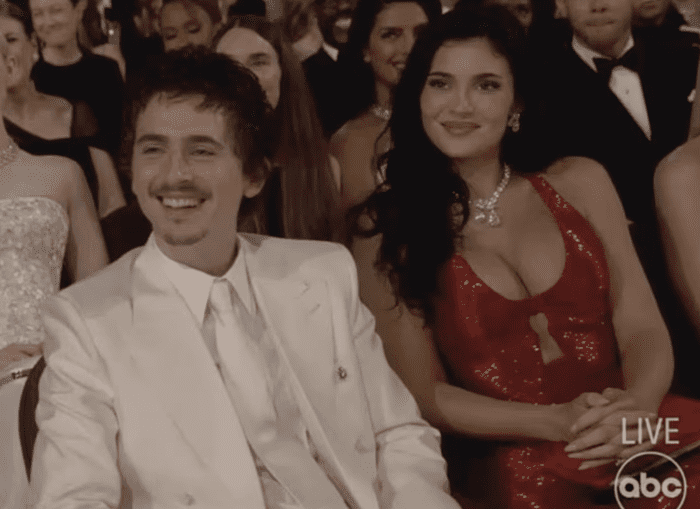 Затем камера быстро переключилась на Тимоти Шаламе, который нервно улыбался рядом со своей пышногрудой девушкой Кайли Дженнер.