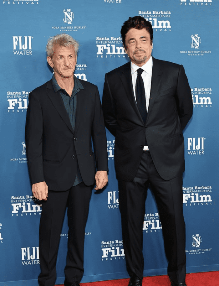 Имя 65-летнего актера, получившего премию «Оскар», было названо Кираном Калкиным в номинации «Лучшая мужская роль второго плана» за работу в фильме «Одна битва за другой», но самого Пенна в здании не было (на фото Пенн с коллегой по фильму и номинантом Бенисио дель Торо в Санта-Барбаре в прошлом месяце).