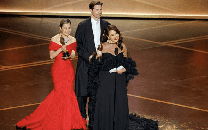 Вторая награда вечера стала сенсацией: фильм «Охотники за демонами» получил приз за лучший анимационный полнометражный фильм (слева направо: Мэгги Канг, Крис Аппельханс и Мишель Л. М. Вонг)